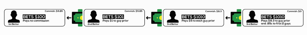 1st bet $100, pays no commission, and receives 100% of the commission from 2nd bet.